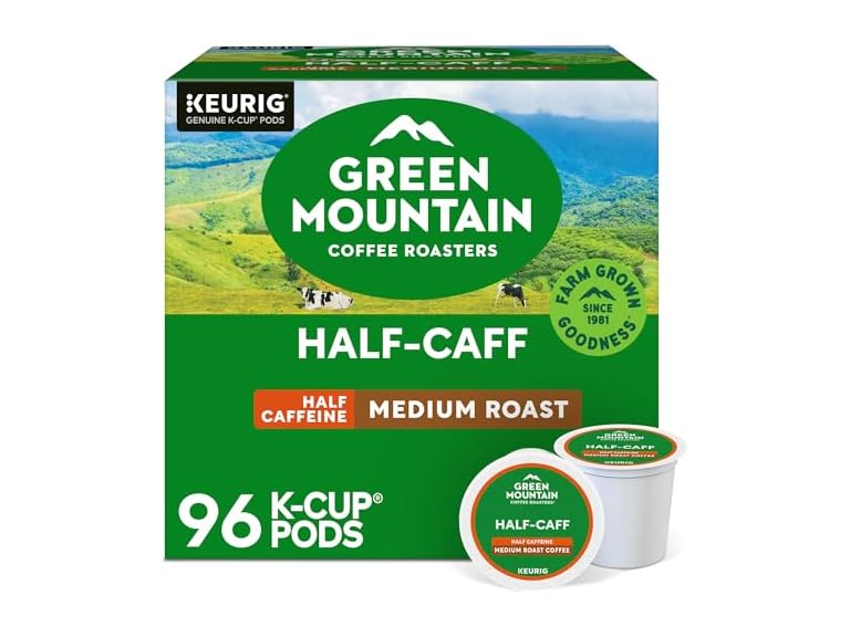 - (1) Green Mountain Coffee Roasters Half Caff Coffee, Keurig Single-Serve K-Cup pods, Medium Roast, 96 Count
