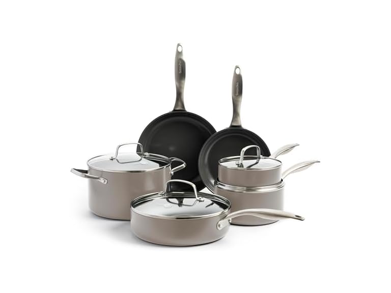 - (1) GreenPan Canterbury 10 Piece Cookware Pot and Pans Set, Hard Anodized PFAS-Free Healthy Ceramic Nonstick, Stainless Steel Handles, Versatile Cooking Essentials, Dishwasher & Oven Safe, Clay