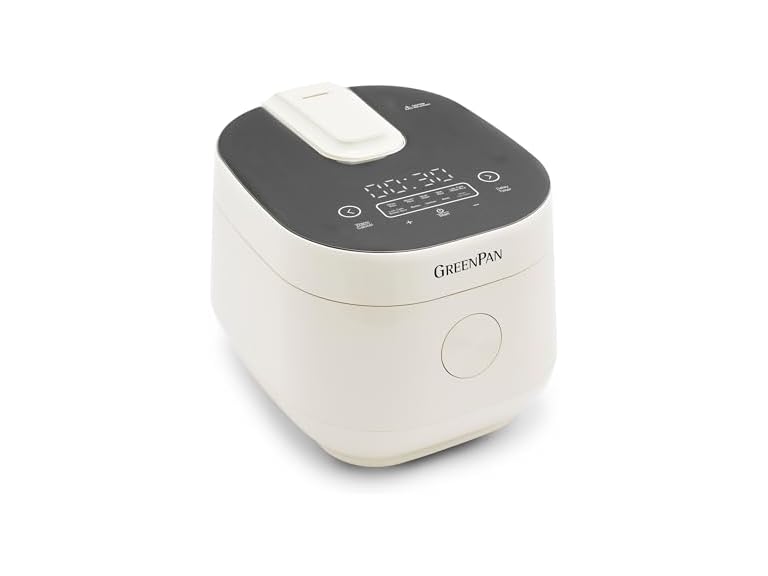 - (1) GreenPan Carb Reducing Electric Rice Cooker, 4 Cups Uncooked/8 Cooked Rice, 10 Presets, LED Display, Healthier Meals, Delay Timer, PFAS-Free Ceramic Nonstick Removable Bowl, Cool Touch, Steam, Cream