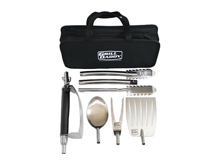 - (1) Grill Daddy BBQ Tailgate Grill Accessories Set — 6 Piece Full Size Barbeque Set — Spatula Tongs Fork Spoon and Multitool — Comes in Nice Carrying Case — Great Gift — Easy Storage
