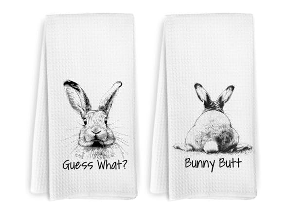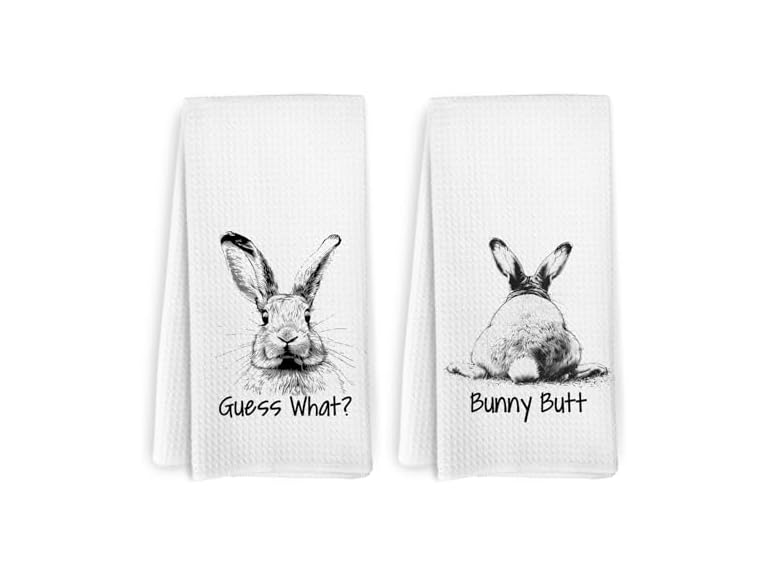 - (1) KFXHANGD Guess What? Bunny Butt Kitchen Towels and Dishcloths Set of 2, Funny Easter Bunny Dish Towels, Bunny Lover Gifts, Rustic Bunny Rabbit Decorative Hand Tea Towels for Bathroom Kitchen, 16x24