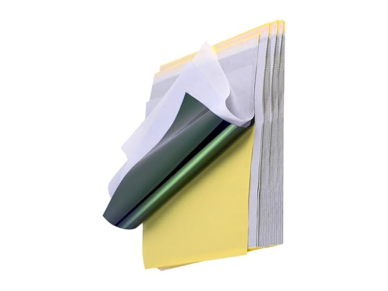 - DESIGN CONCEPT - Tattoo Transfer Paper kit for tattooing is a 4-ply sheet that, includes white master sheet, semi-transparent protective tissue blue carbon page and yellow backing sheet. A4 size not only adapts to most tattoo patterns, but also can cut into small pieces to use!