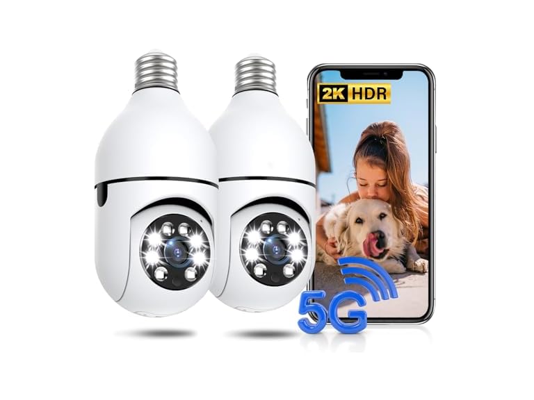 - Dual-Band WiFi for Reliable Coverage (5G & 2.4G): This light bulb camera combines 5G and 2.4G WiFi for stronger signals and wider coverage. Easy to install in any E27/E26 socket (110V-240V) or power outlet by included adapter, it’s perfect as a light bulb camera outdoor or indoor, ensuring seamless connectivity
