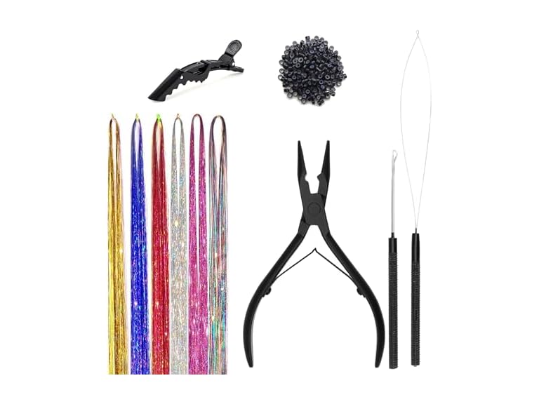 - Fairy Hair Tinsel Kit: Glitter Hair Extensions with Tools. You will get 1200 strands of hair tinsel in 6 different colors along with 1 Loop, 1 crochet hook, 1 plier, 1 hair clip, 100 black micro silicone link rings beads. These tools are made of steel, and they're great for micro link hair extensions and beads hair extensions.