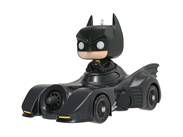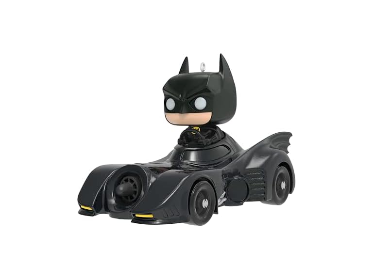 - Relive the adventures of the popular 1989 "Batman" movie with this Batman in his Batmobile Hallmark Keepsake Christmas ornament. Features Funko POP! styling of the Caped Crusader in his Batmobile.
