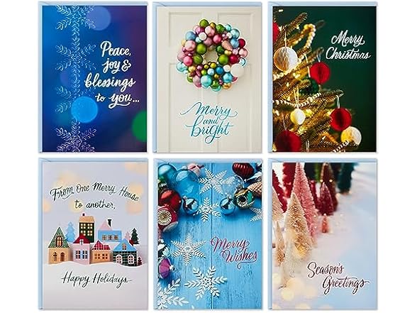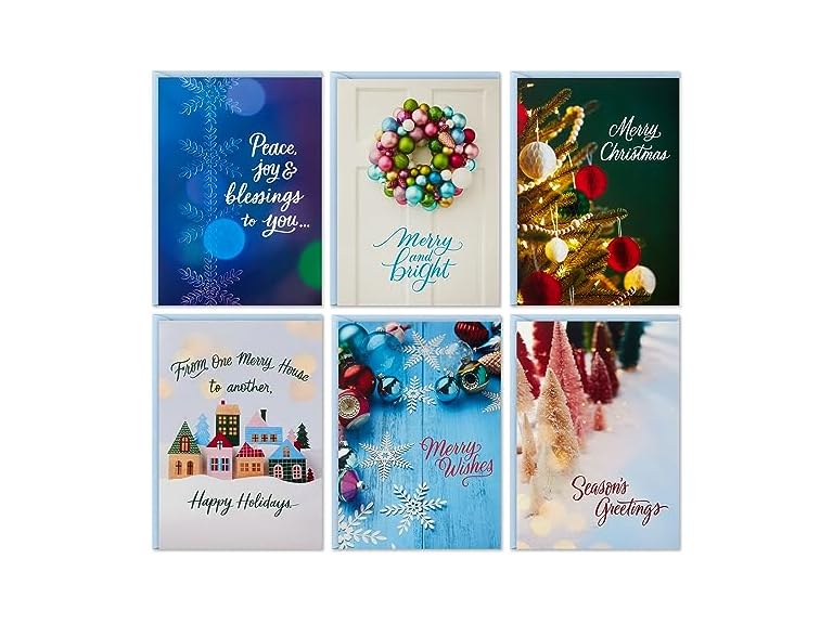 - Assorted boxed set includes 6 elegant designs with script lettering and festive photography of pink and red bottle brush trees, pastel ornament wreaths, blue snowflakes and cute cottage homes; inside is blank for you to write a personalized holiday message