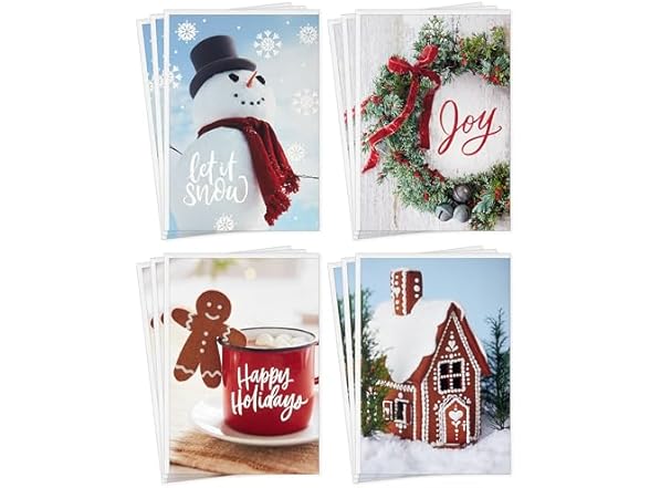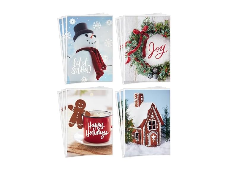 - Pack of 12 holiday cards features 3 each of 4 cute holiday photographs: A smiling snowman with "Let it snow," gingerbread boy on a mug of cocoa with "Happy Holidays," classic wreath with jingle bells and "Joy," and fancy gingerbread house.
