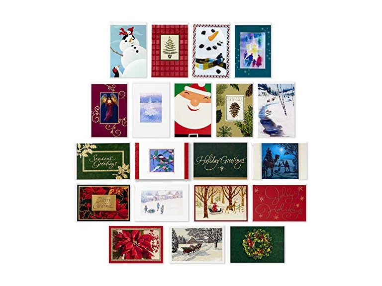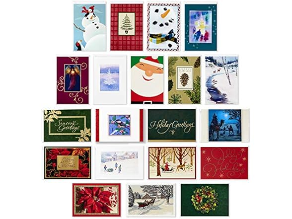 - Cards feature designs with seasonal favorites including snowmen, poinsettias, Santa Claus, a Christmas tree, and more.
