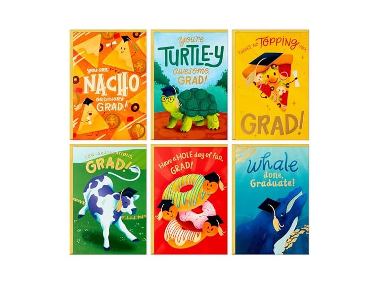 - Pack of 36 graduation cards includes 6 colorful designs with silly puns, including "You are NACHO ordinary grad," "WHALE done, Graduate," "You're TURTLE-Y awesome, Grad," and "COW-gratualtions, Grad!"