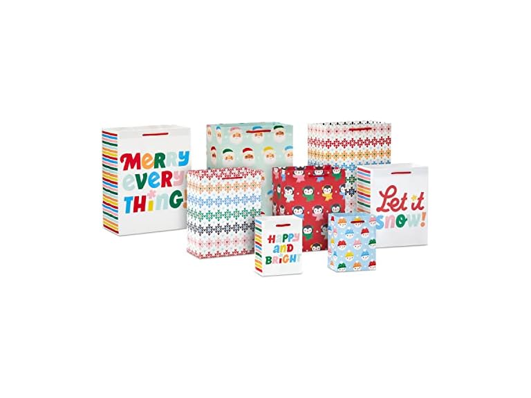 - FUN AND FESTIVE: Set of adorable gift bags include a variety of designs in rainbow colors: Snowmen, penguins, Santa, "Merry Everything," "Let it snow," "Happy and Bright" and needlepoint pattern in pink, yellow, blue, green and red
