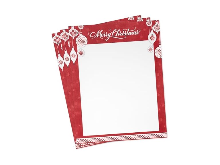 - Purchase includes 60 sheets of holiday newsletter paper featuring red and white ornaments and script "Merry Christmas" lettering