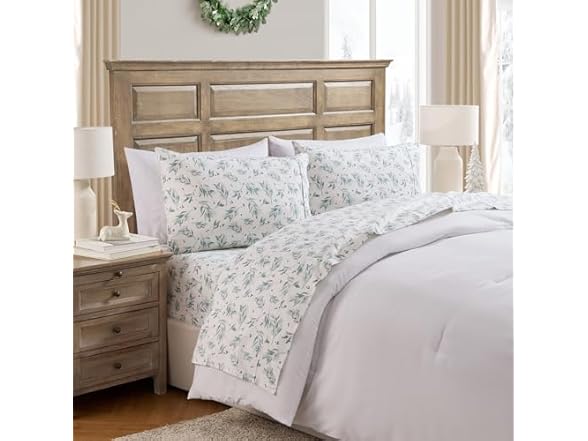 - (1) Hallmark King Size 4-Piece Holiday Bedding Set - Flat & Fitted Sheets & Pillowcase | Soft Brushed Breathable Cotton | Durable, Wrinkle Resistant, Cozy & Warm | Deep Pocket Sheets | Leafage White/Green