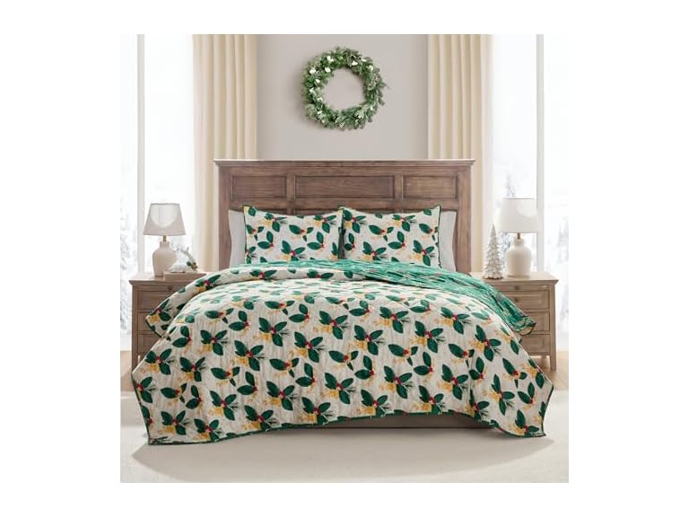 - REVERSIBLE HOLIDAY BEDDING: Two festive looks in one—poinsettias on a snowy white background on one side, and holly leaves and berries on rich green on the other..