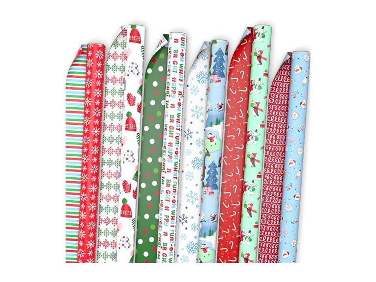 - Pack includes 6 reversible Christmas wrapping paper rolls: colorful stripes/snowflakes, polka dots/merry lettering, knit diamonds/winter wear, Santa ice cream truck/blue snowflakes, doodles on red/Christmas treats, candy canes on red/penguins.