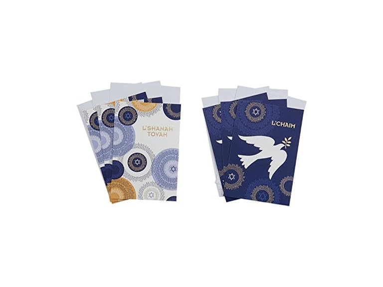 - Card pack features two different blue, white, and gold designs accented with foil (3 of each design) Inside of card reading "L'Shanah Tovah" on its cover reads: "To a year filled with the daily blessings that make life sweet!"