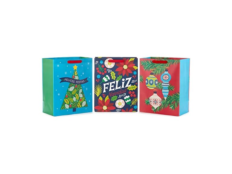 - (1) Hallmark VIDA 13" Large Christmas Large Gift Bag Bundle (3 Spanish Gift Bags: Feliz Navidad, Felices Festas, Tree, Flowers, Colorful Ornaments)