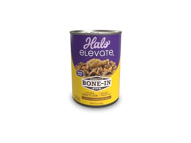 - (1) Halo Elevate Wet Dog Food Homestyle Bone-in Chicken Stew with Sweet Potatoes & Kale Recipe, Grain Free Canned Dog Food, 12.7 Oz Can (Pack of 6)