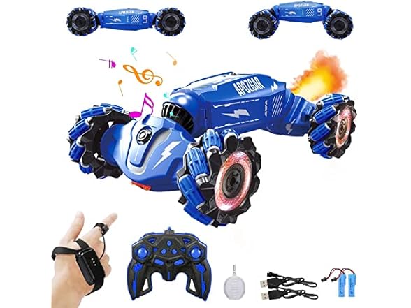 - 【FULL FUNCTIONAL STUNTS】The gesture rc car main Functions: Forward/backward,turn right/left, right/left drift, extreme 360 rolling, double-sided 4WD driving, transform mode, One key turn on/off the music, Colorful Lights, Spray fog steam, Deomostration function. Drifting all direction.