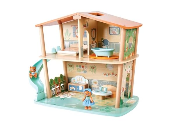 - TIGER DOLL HOUSE: Two-level wooden dollhouse play set for toddlers and preschoolers! Your child will love these little tigers, with all their accessories. There are two tigers in the set, and they can sit, stand, grip things with their hands and slide from the top level to a pond.