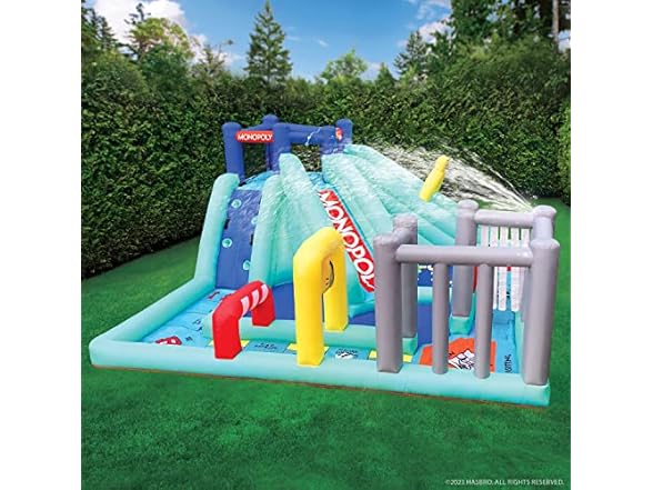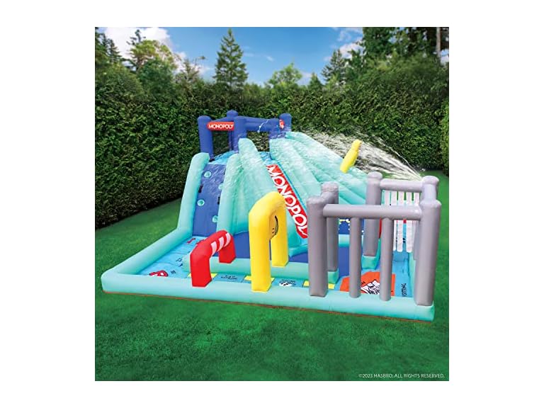 - MEGA MONOPOLY FUN! Guaranteed to deliver endless fun and laughs, the Monopoly Splash Game Mega Inflatable Obstacle Course is a great way to engage kids in active outdoor play. Adult supervision is always recommended. Fun for 2-4 players ages 5-10.