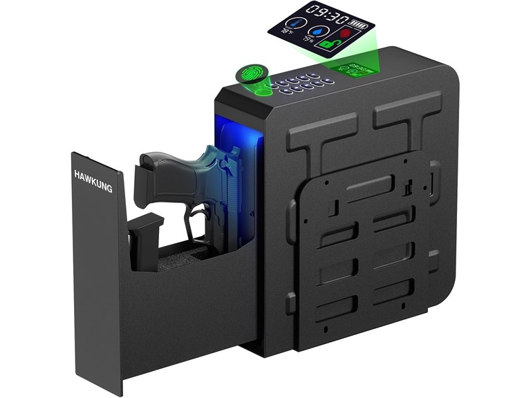 - LCD Temperature & Humidity : The bedside gun safe Built-in LCD screen shows real-time temperature and humidity. Add dry packs if too humid to prevent moisture damage. Displays battery level for timely replacement, ensuring smooth operation and easy maintenance of your firearm storage environment.
