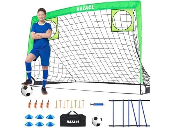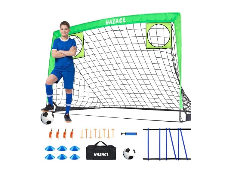 - (1) Hazacl Kids Soccer Goal for Backyard, 6x4 9x5 FT Portable Soccer Nets Pop Up with Ball, Agility Ladder, Cones, Target & Carry Bag for Toddler Youth Outdoor Indoor Training Practice Sports Games Play