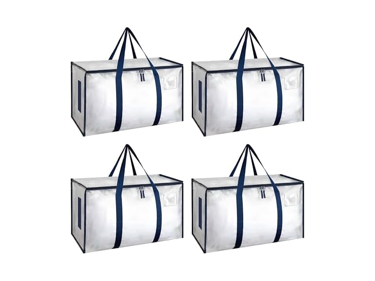 - (1) HealSmart 4 Pack Large Moving Bags with Zippers & Handles, Moving Supplies with lids, Heavy Duty Totes for Space Saving, Fold Flat, Moving and Storing, Clear