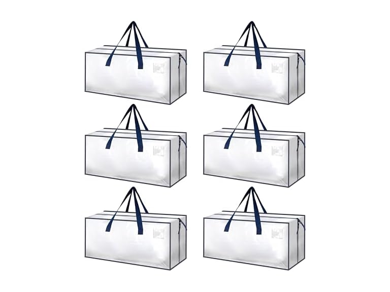 - (1) HealSmart 6 Pack Extra Large Moving Bags with Zippers & Carrying Handles, Heavy-Duty Storage Tote Moving Boxes for Dorm Room Essentials Storage Bags, Clear