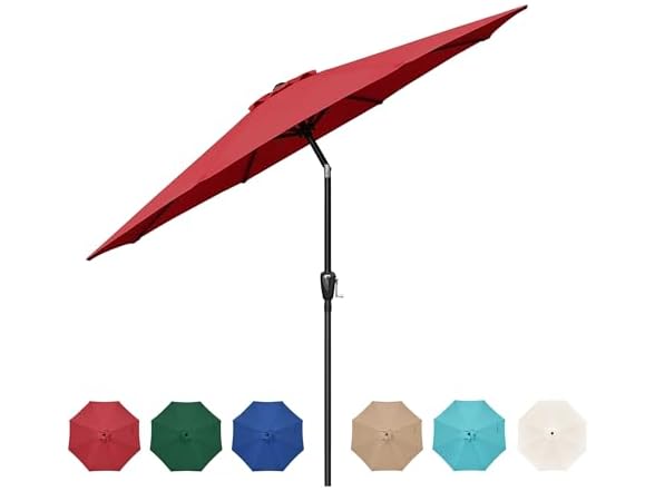 - (1) HealSmart 9' Outdoor Patio Umbrella, Market Table Umbrella with 8 Sturdy Ribs, Push Button Tilt and Crank for Garden, Yard, Pool, Red