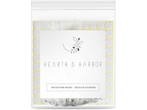 - (1) Hearth and Harbor 100 6-Inch Cotton Wicks + 100 Double-Sided Heat Resistant Candle Stickers - Wicks for Candle Making and Adhesive Candle Wick Stickers