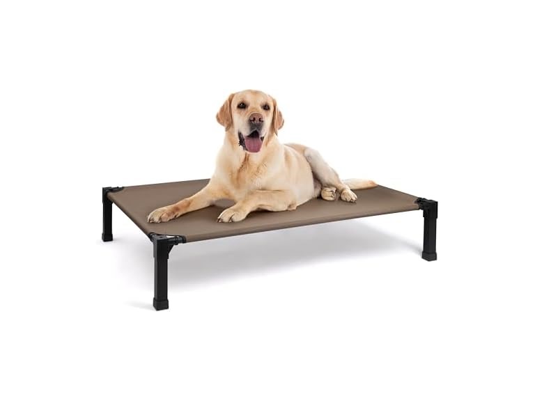 - (1) Heeyoo Elevated Dog Bed, Cooling Raised Pet Cot with Chew Proof Washable Breathable Mesh and Metal Frame, Portable Dog Cot Bed with No-Slip Feet for Outdoor or Indoor Use 51"L x 36"W x 9.3"H