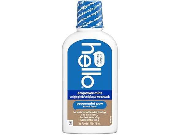 - (1) hello Empower-Mint Fluoride Free and Alcohol Free Mouthwash, Peppermint Pow, 16 Fl Oz Bottle