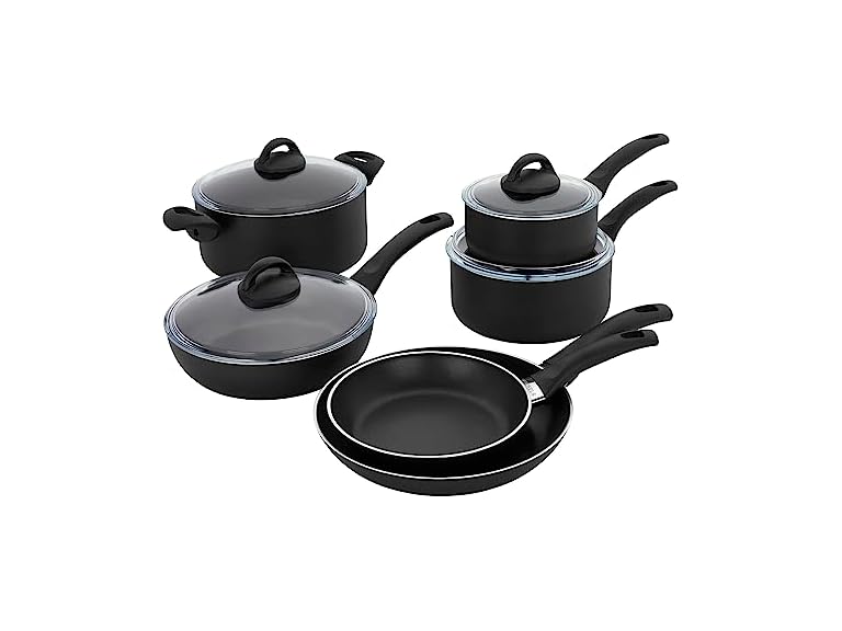 - QUICK HEATING: Lightweight aluminum construction cookware set heats up evenly and quickly.