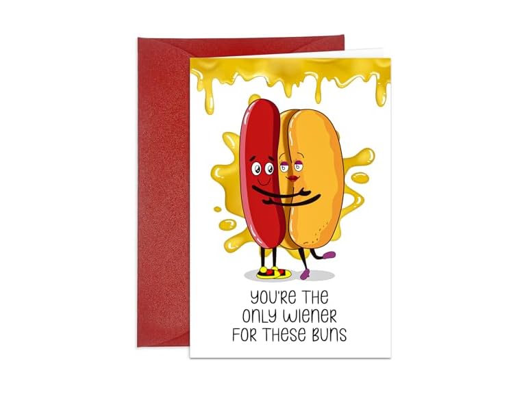 - Funny Valentine Day Cards for Him: Looking for a card that will make your girlfriend or wife laugh out loud? Our funny Valentine's Day cards for him men are designed to bring humor and a smile, featuring " YOU'RE THE ONLY WIENER FOR THESE BUNS ", making it an ideal Valentine's Day gift for that special man in your life.