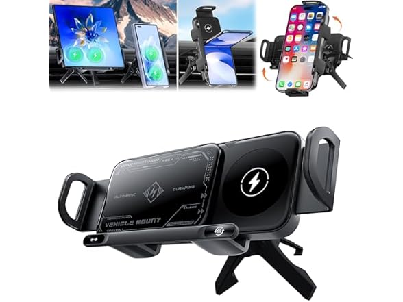 - [Multi-purpose Design] Cell Phone Car Mount is not only a wireless car charger, but also a high intelligent mobile phone/pad holder. 2 in 1 Auto Rotating Phone Holder is compatible with a wide range of cell phones and tablets, supports a variety of devices and sizes. Supports 99% of car vents and the triangular force structure ensures stability