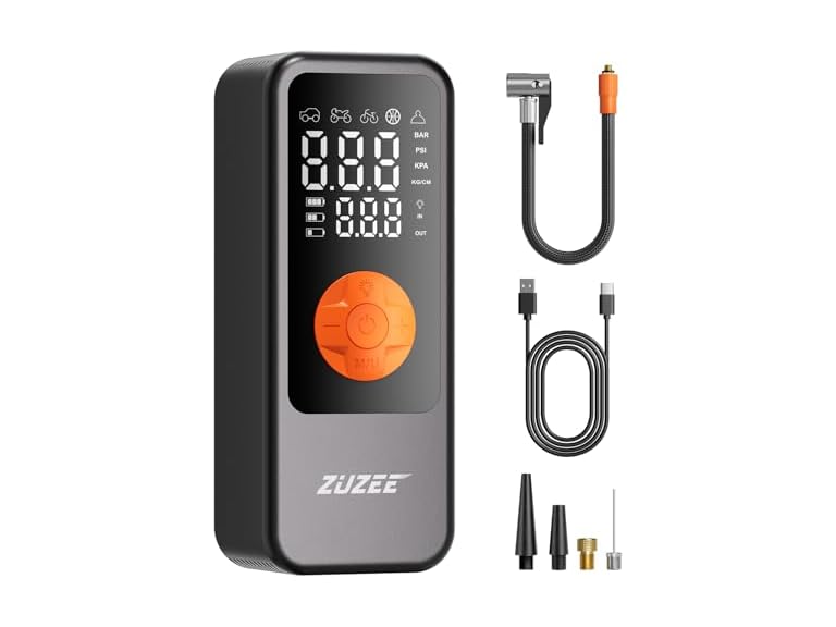 - [Own More, Spend Less] With 5 preset modes for cars, motorcycles, bikes and balls, as well as a custom mode up to 160PSI, the ZUZEE portable car tire inflator is an excellent value. It is compatible with a wide range of vehicles (including SUVs, MPVs and pickups), and comes with 4 valve adapters to meet all your inflation needs. Equipped with a built-in sensor that accurately measures tire pressure in real time, the LED screen ensures you can easily view tire pressure values.