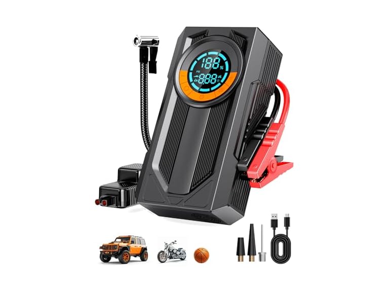 - 【Fast 150 PSI Tire Inflator】This car jump starter with air compressor delivers up to 150 PSI for rapid inflation. Boosts tire pressure from 30 to 35 PSI in just one minute and fully inflates a standard car tire within minutes. The large LED display clearly shows real-time and preset pressure values, and 4 extra nozzles let you inflate car tires, bikes, motorcycles, and sports equipment.