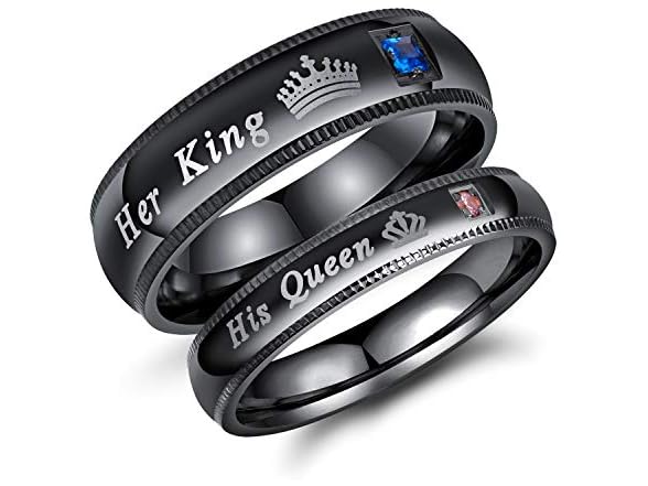- (1) 2Pcs Black Stainless Steel His Queen & Her King Couples Rings Set Wedding Engagement Band (Male Size 12 & Female Size 6)