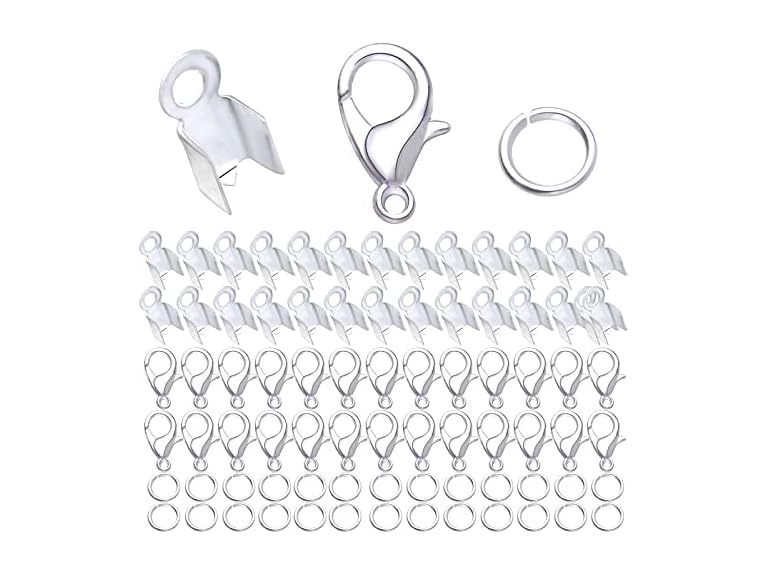 - (1) Hmjpng 500pcs Silver Jewelry Making Accessories Kit, 200pcs Fold Over Cord End Caps Crimp End Tips, 200pcs Open Jump Rings and 100pcs Lobster Claw Clasps for Leather Ribbon Jewelry Making Findings