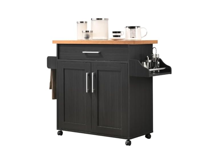 - Hodedah Rolling Wood Kitchen Island Cart with Spice Rack, Towel Rack, Utensil Drawer plus Cabinet, Black with Beech Top
