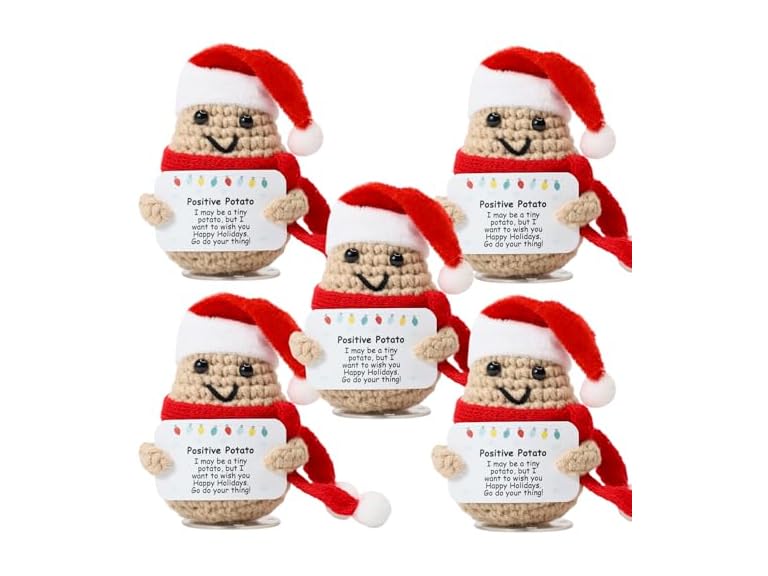 - (1) The trend collection 5-Pack Beige Holiday Positive Potatoes with Stands ‚Handmade Crochet, Bulk Funny Gifts for Teachers, Emotional Support Desk Toys, Stocking Stuffers