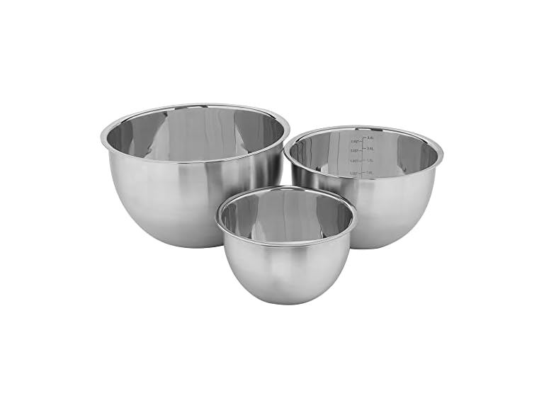 - STURDY STRUCTURE: The bowls are made from durable stainless steel, making it last through rigorous cooking activities. The silicone bottoms keep the bowls in place and prevent sliding as you are working with them. Each bowl also has high walls to keep your ingredients and batter in place.