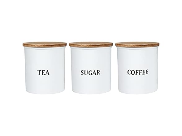 - Our coffee bar canisters crafted with high quality materials to ensure durability and longevity. Coffee tea sugar container set of 3 combining elegance with practicality. This kitchen canister set ensures long-lasting use and adds a touch of elegance to your kitchen.