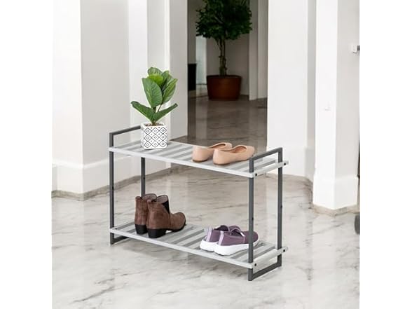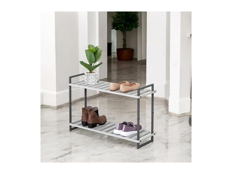 - Honey-Can-Do 2-Tier Steel Shoe Rack, Slatted Shelves, Tube Piping, Grey & White, 30”W x 11”D x 20”H