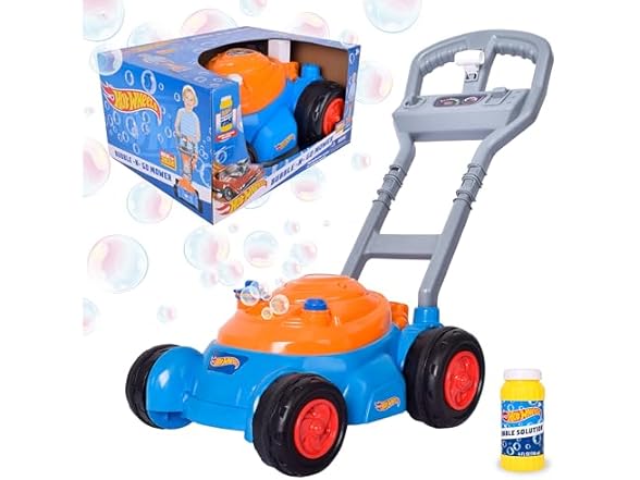 - Hot Wheels™ Bubble Lawn Mower for Toddlers, Bubble Blowing Machines, Indoor/Outdoor Gardening Toy, Birthday Gift for Prechool Girls and Boys, No Batteries Required, Includes Bubble Solution, 2+