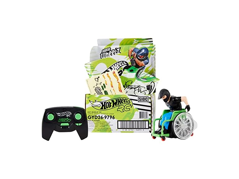- (1) Hot Wheels RC Aaron Wheelz Wheelie Chair, Remote-Control Wheelchair with Motocross Aaron "Wheelz" Fotheringham Figure
