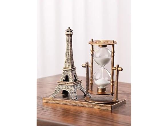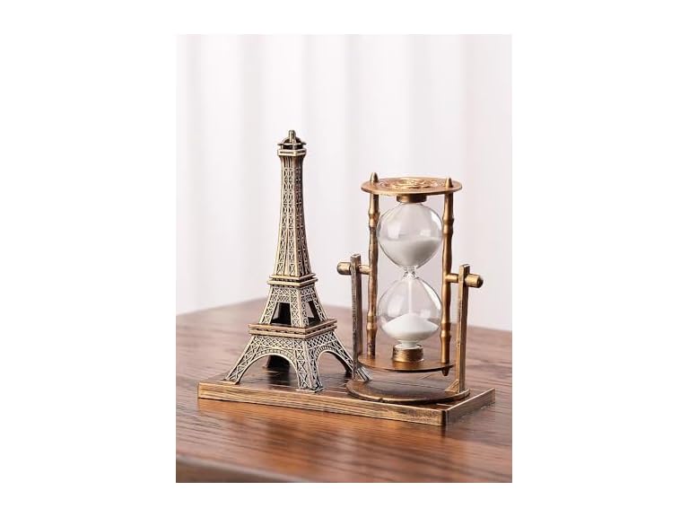 - VINTAGE DESIGN: Beautifully crafted decorative hourglass with landmark miniatures (Eiffel Tower/Ship/London Eye), featuring an antique bronze finish and wooden base