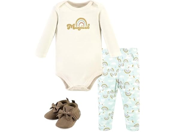 Hudson Baby bodysuit, pant, and shoes sets are an adorable, fashionable outfit to dress your baby for a day out. Your little one will be the most stylish, comfortable baby in the neighborhood with our bodysuit and pant and matching pair of shoes.