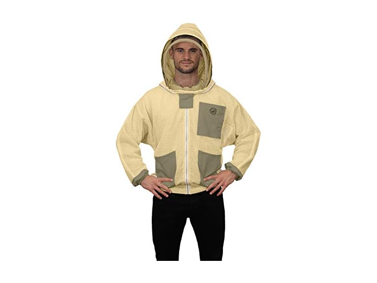 - Aerated beekeeper jacket with collapsible fencing veil, heavy duty brass zippers, durable polycotton-lined pockets, and deluxe canvas carrying case