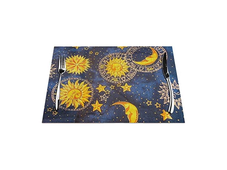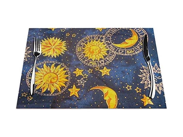 - (1) IBILIU Sun Moon Placemats Set of 4, Sun Moon Stars Space Nebula Placemats Heat Resistant for Dining Table Non-Slip 18x12 Inches